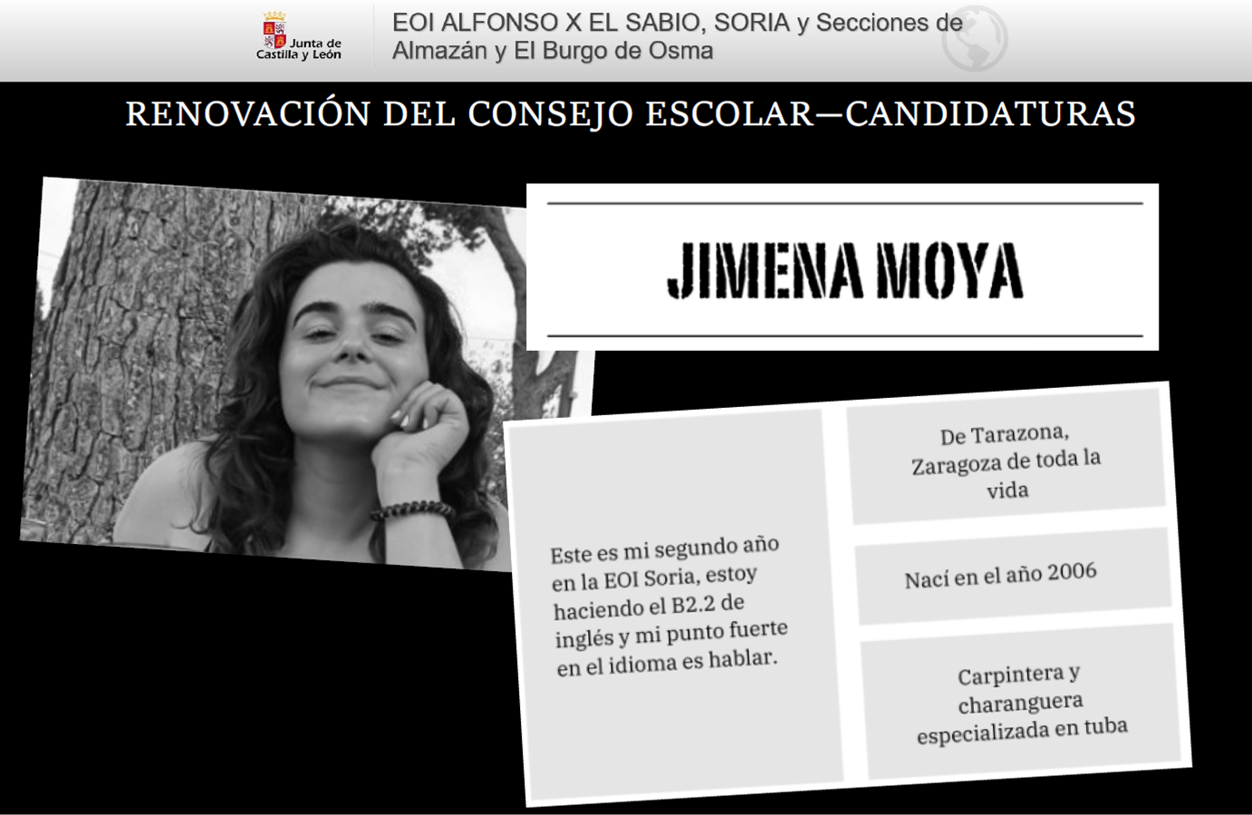 Representante de padres/madres/tutores de alumnos menores Plazo prorrogado hasta conseguir una candidatura Candidaturas a representantes de alumnado de noviembre Hidalgo Hernández, Charlotte Sainz Ruiz, Julián Moya López, Jimena Valero de Miguel, Amaya Sáenz Santolaya, Nerea Vera Lerín, M. Teresa 20 de noviembre - Votaciones HORARIO DE MESAS ELECTORALES Soria: de 11.00 a 12.00h. y de 17.40h. a 19.15h. Almazán: de 18.10h. a 18.40h. El Burgo de Osma: de 18.40h. a 19.10h. --------------------------------------------------------------------------------- Si no vas a poder venir a votar ese día, 'vota por correo' en la conserjería de tu centro del 17 al 19 de noviembre. |